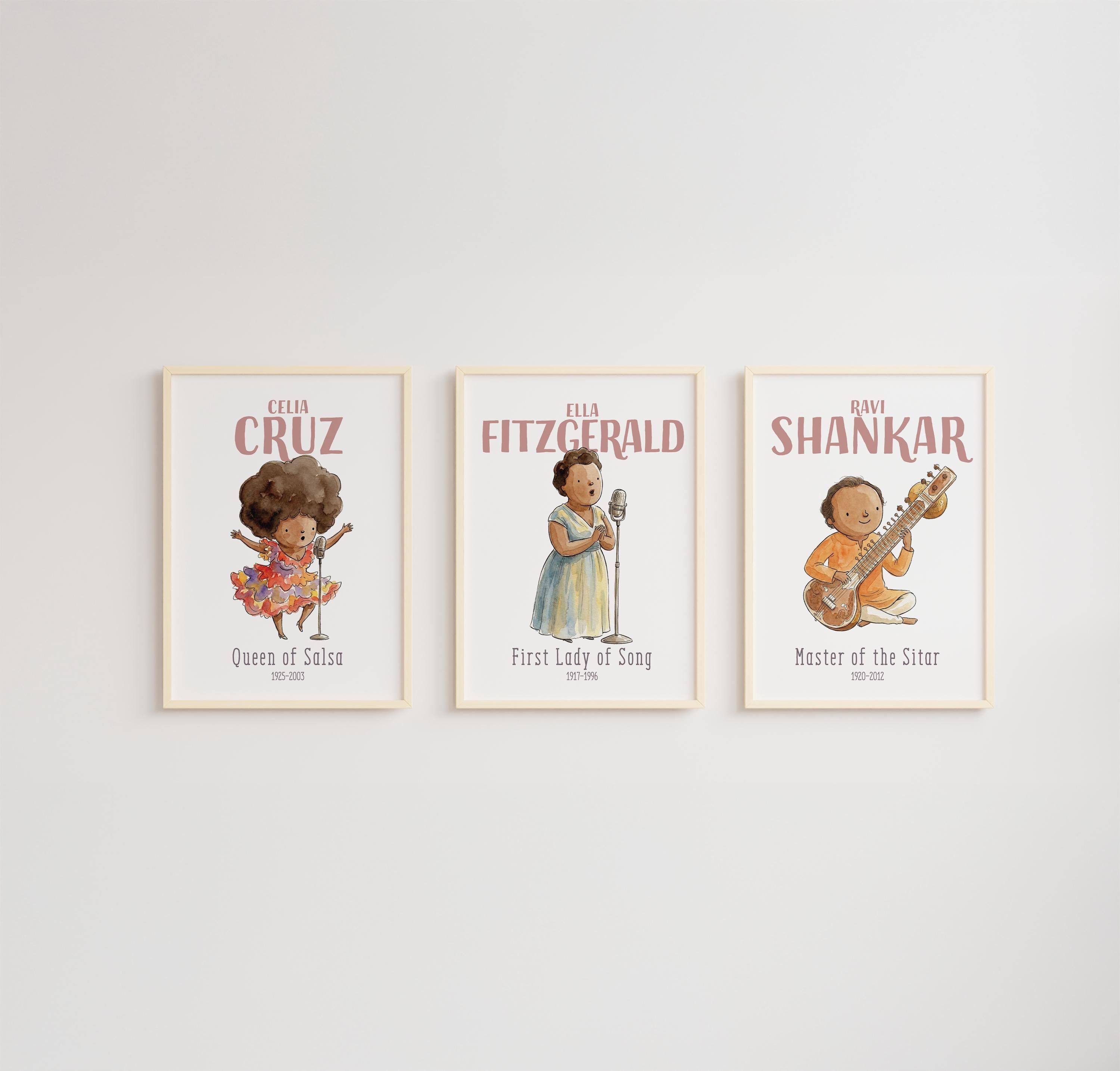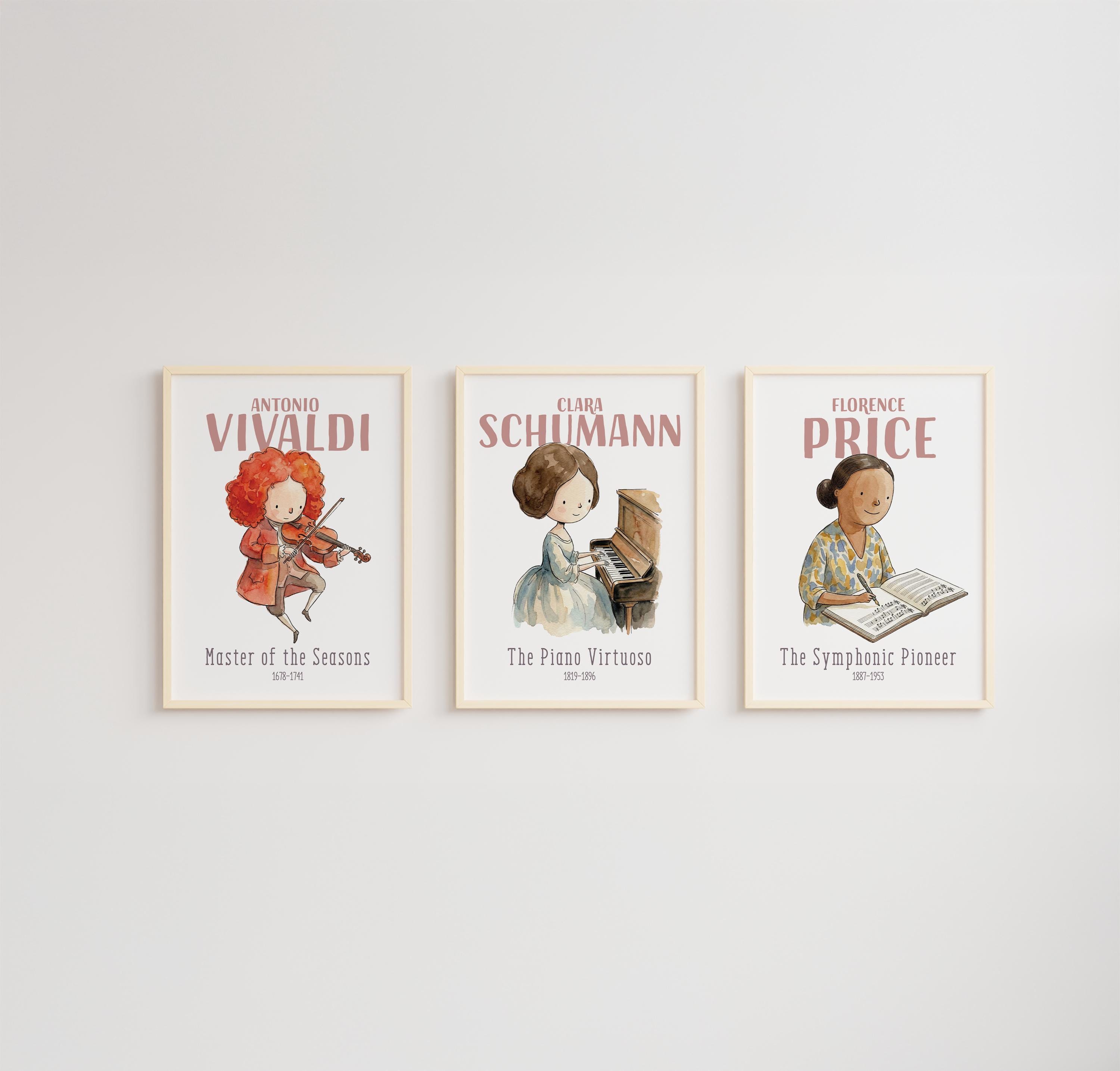 The set includes iconic figures such as Beethoven, Mozart, Bach, Vivaldi, Schumann, Price, Joplin, Armstrong, Simone, Fitzgerald, Cruz, and Shankar—offering a diverse and inspiring lineup of musical trailblazers. Whether you're decorating a music classroom, music theory space, or a music lover’s wall, these posters bring history and creativity together in a vibrant visual celebration of music.