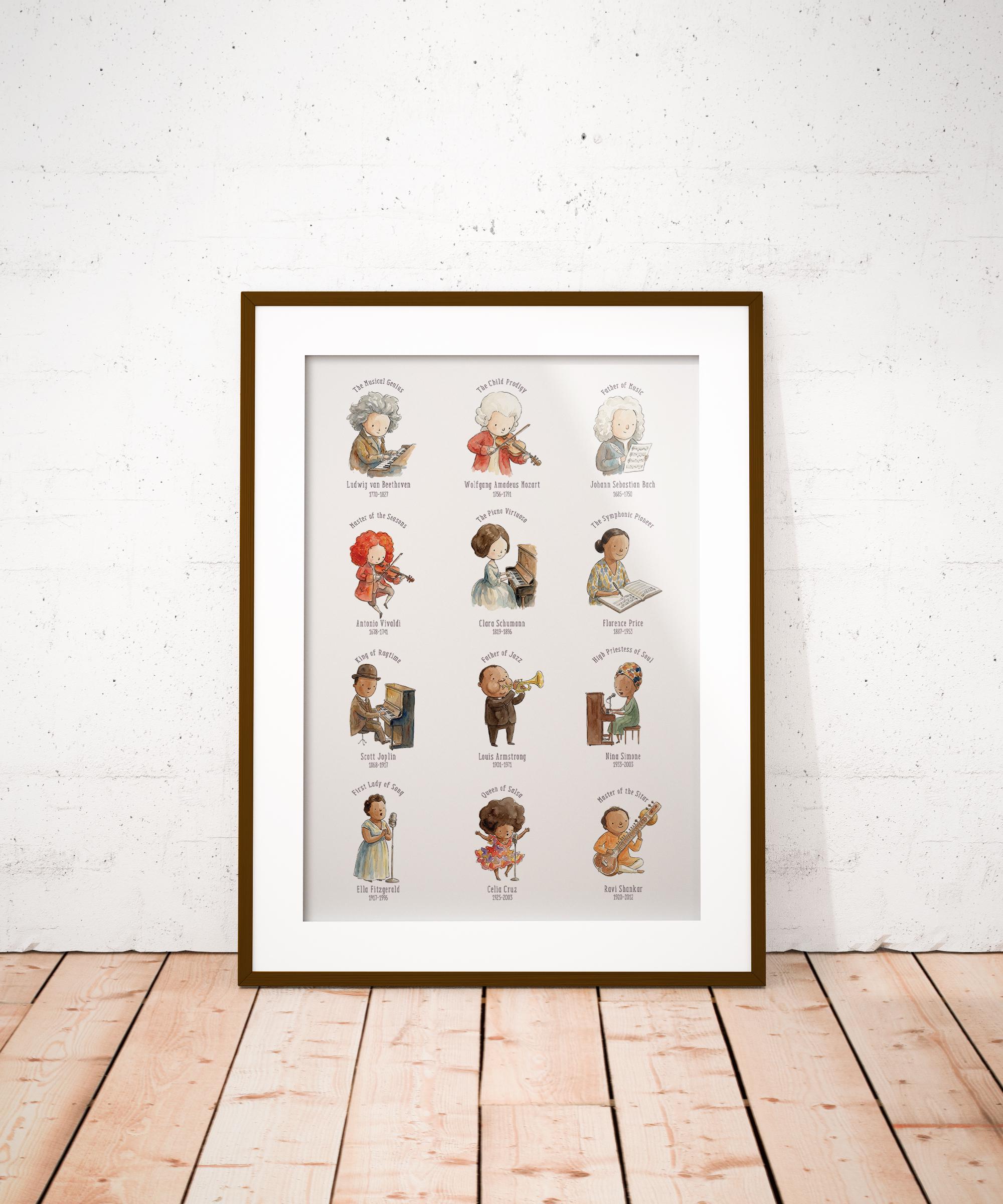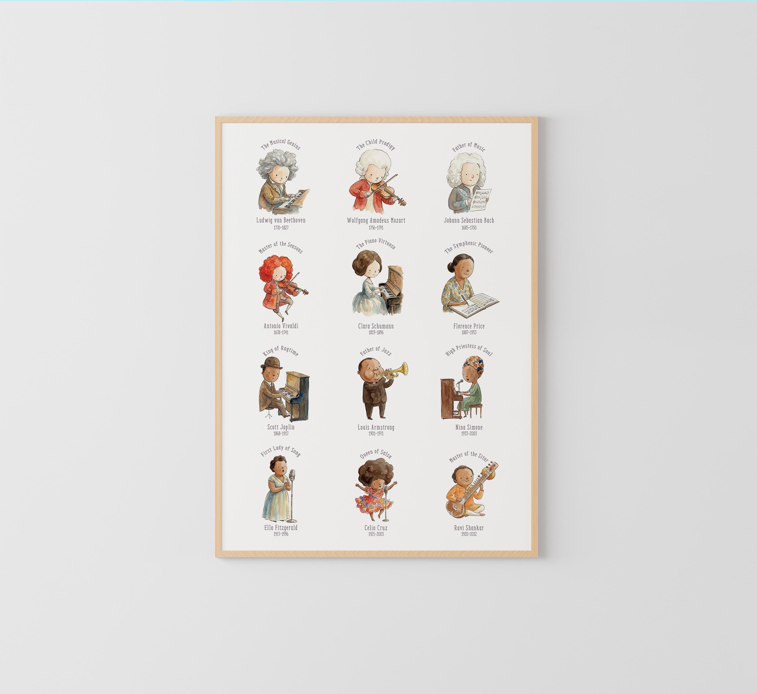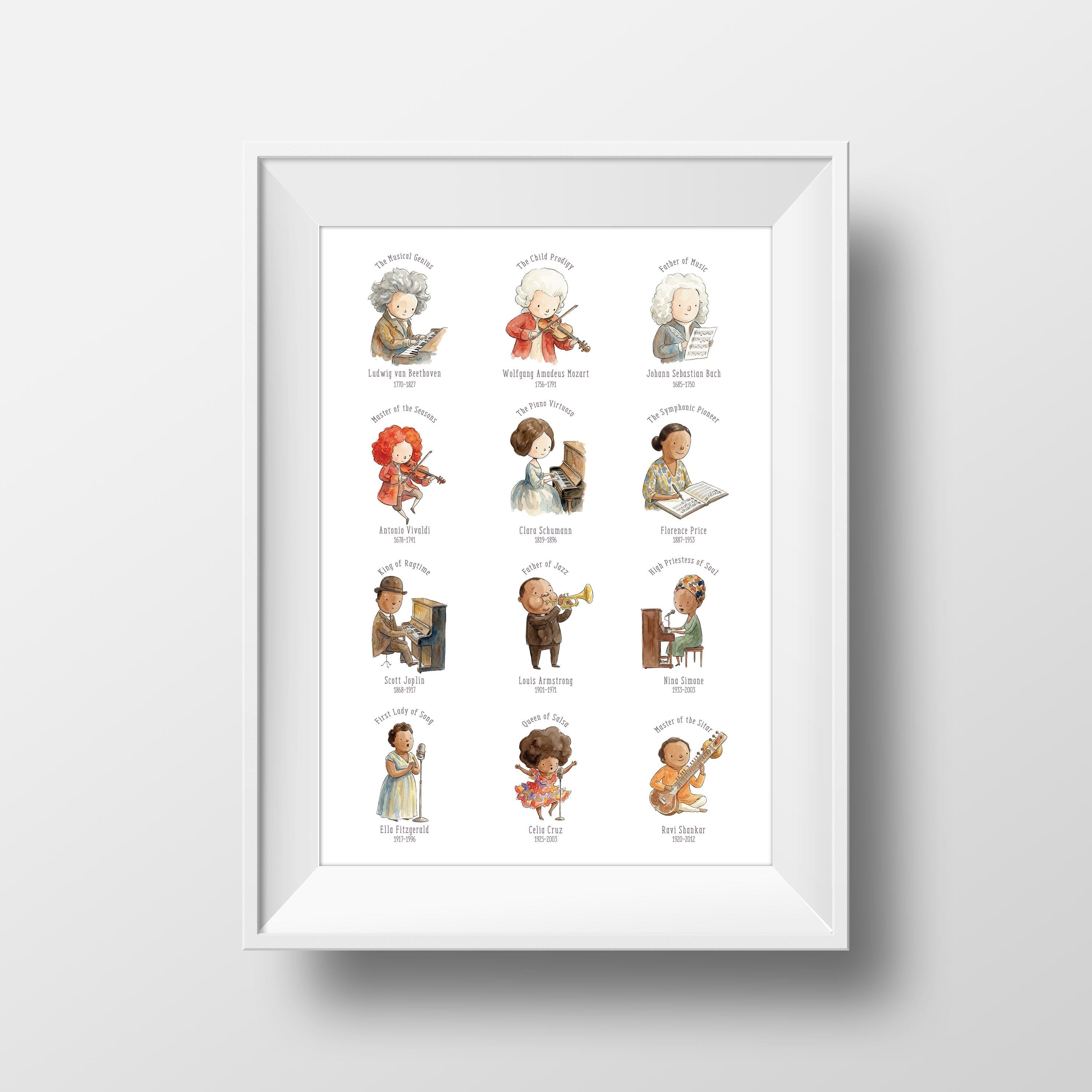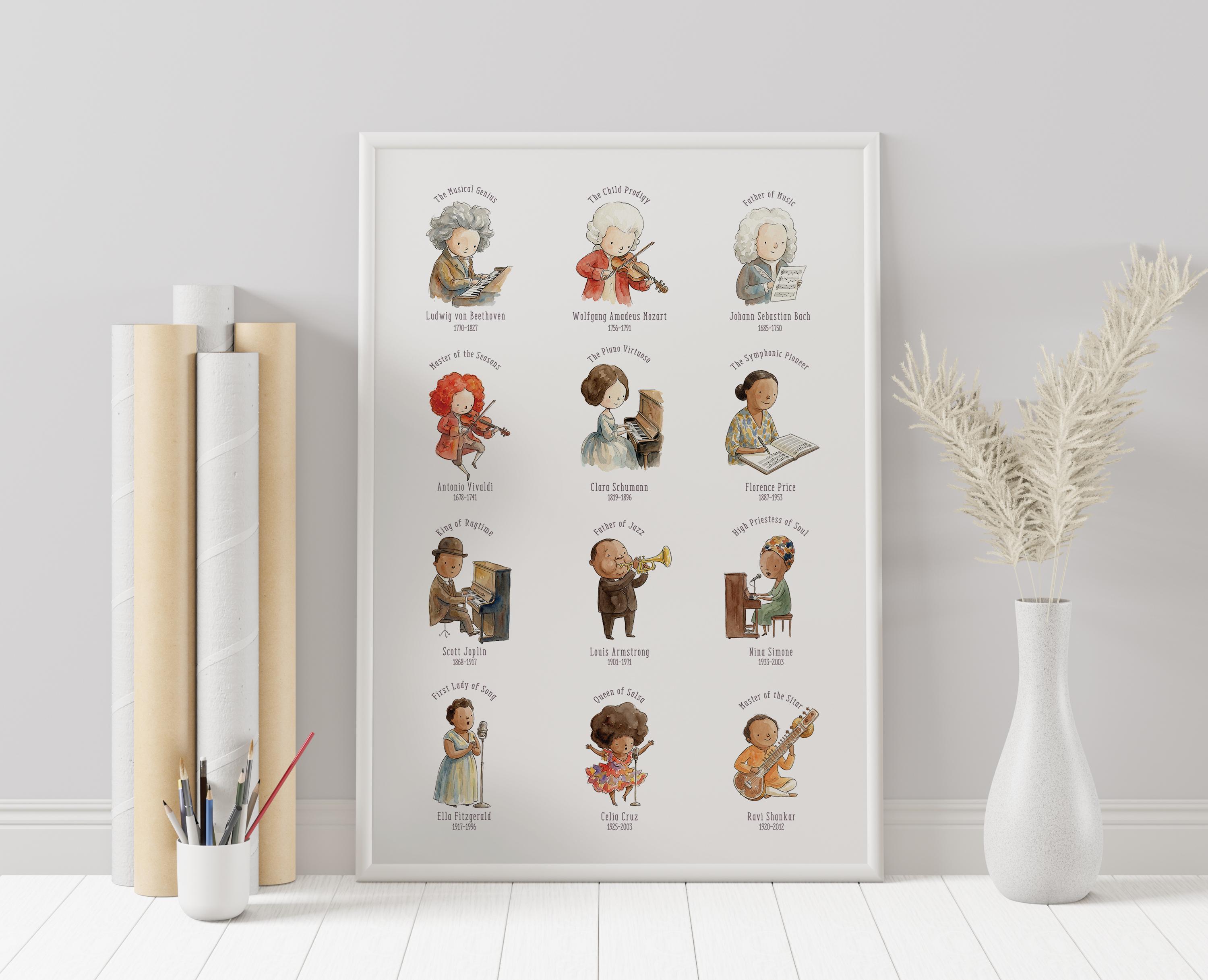 It is a beautiful way to introduce children to important figures in music history while also adding charming decor to the room. This music-themed print is ideal for teachers, parents, and anyone creating an inspiring learning environment for young music lovers.